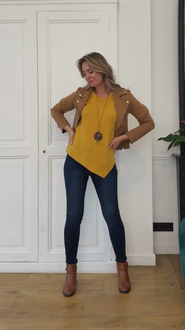 Maglia sottile asimmetrica a maniche lunghe arrotolabili. - Giallo senape