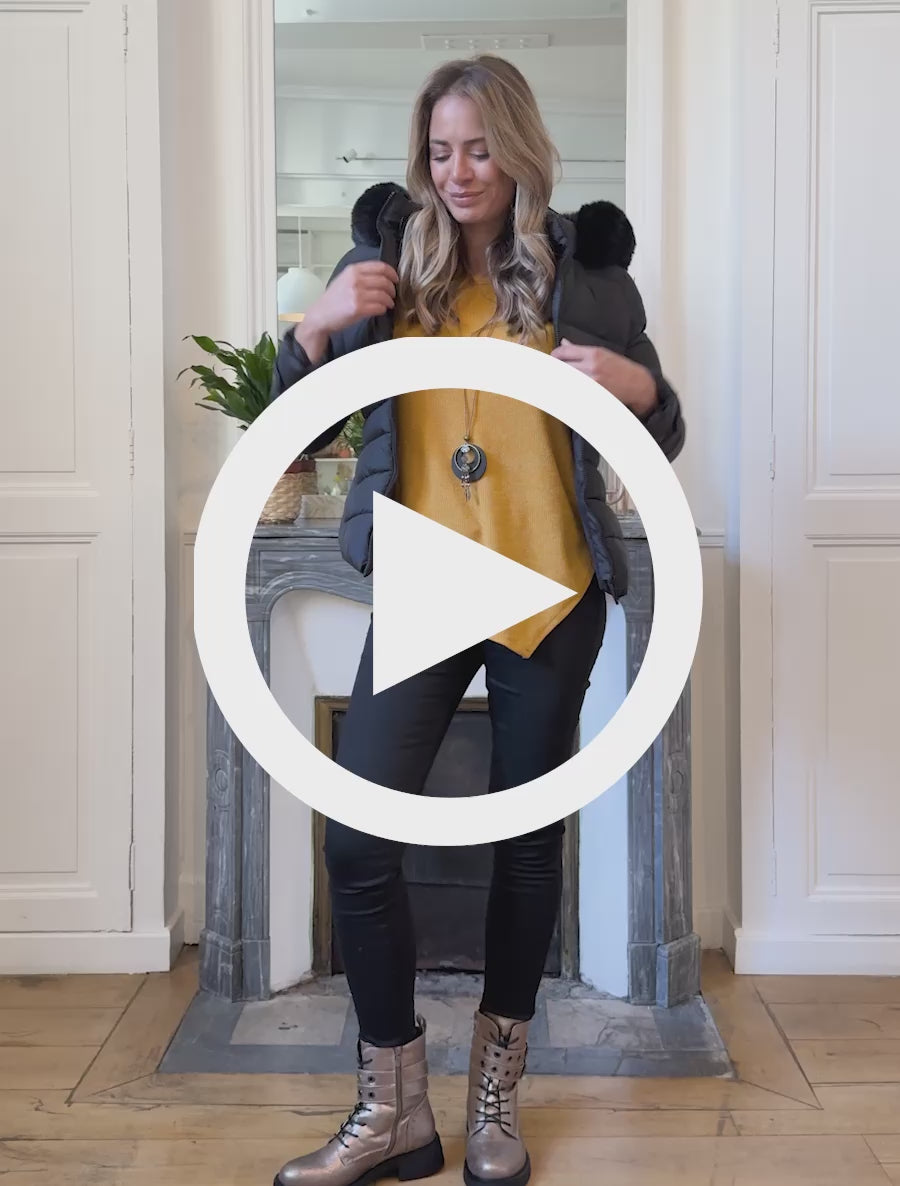 Piumino dritto con cappuccio in pelliccia sintetica. - Nero