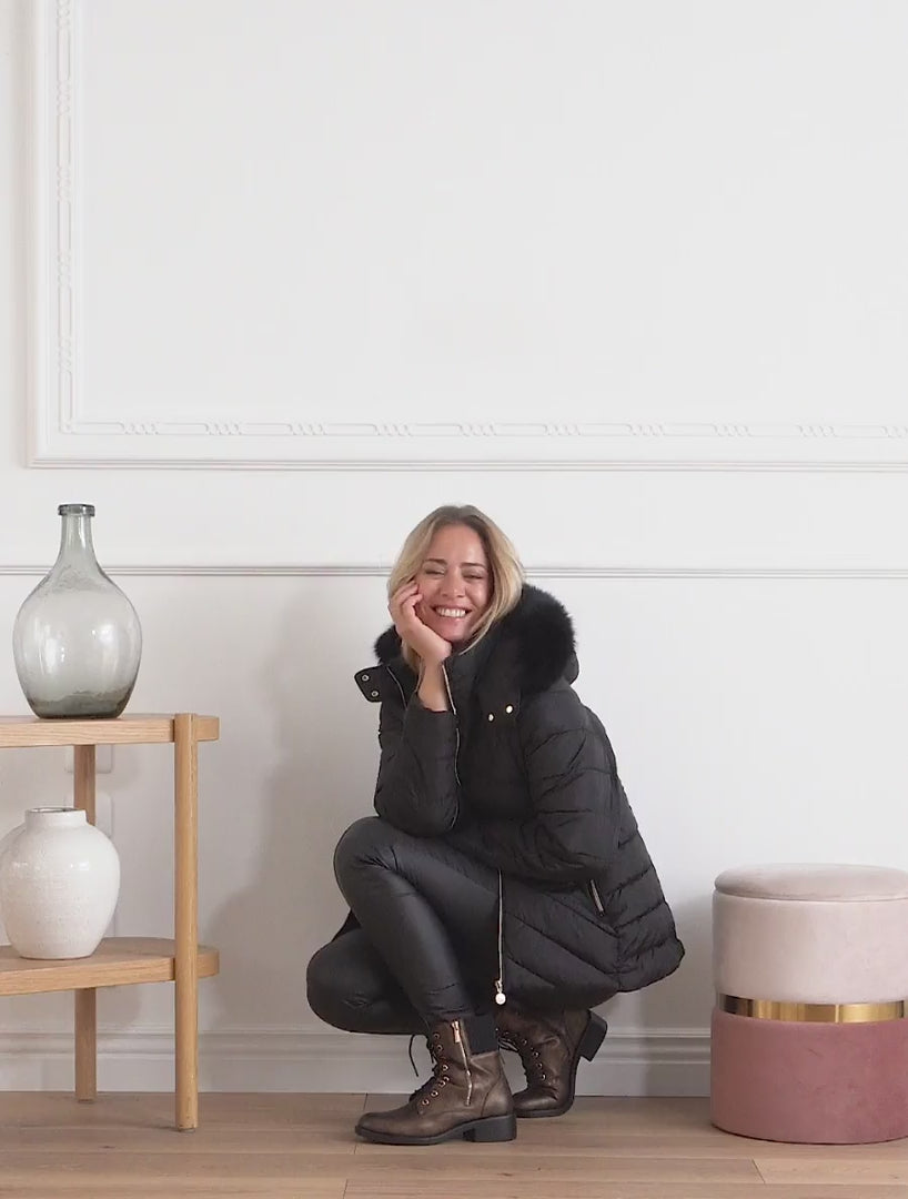 Giubbotto trapuntato con cappuccio in pelliccia sintetica. - Nero
