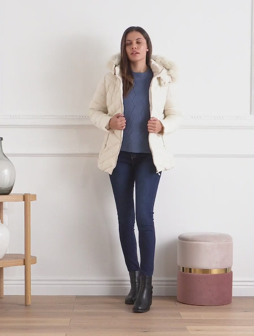Giubbotto trapuntato con cappuccio in pelliccia sintetica. - Crema